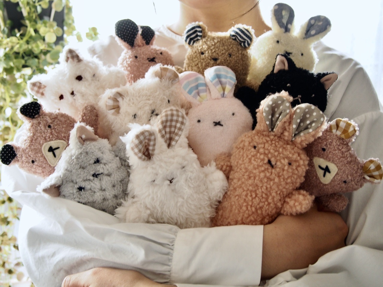 この作品は、ぬいぐるみを一緒に連れて歩けるというコンセプトから生まれました。コーディネートのアクセントになるデザインや、一点ずつ手作りであることにこだわり、使いやすさと機能性を重視しています。表情が少しずつ異なるぬいぐるみは、心を込めて手刺繍でお作りしています。